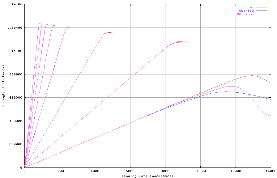 Figure 1 shows that both the tester and the firewall are able to handle packets at the maximum frame rate [1] for all packet sizes of 128 bytes and above. All further tests are done using packet sizes of either 128 or 256 bytes. The degradation for the GNU/Linux machine seems slightly worse than for the OpenBSD machine.