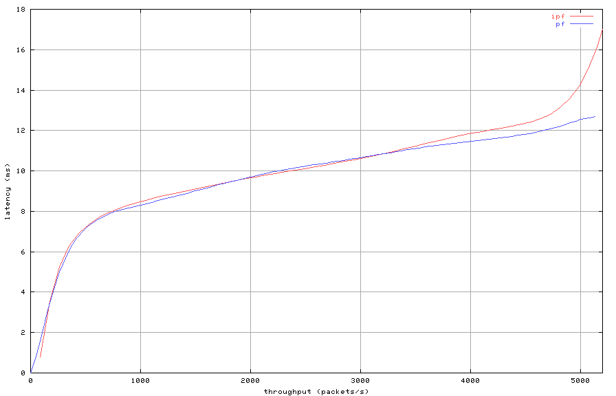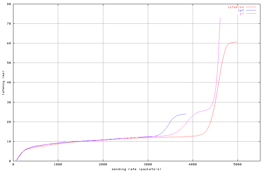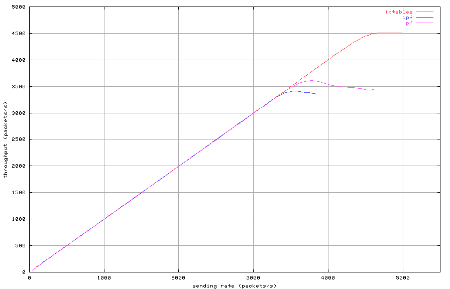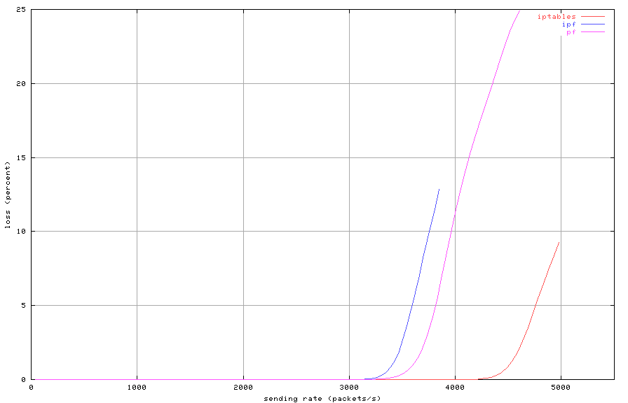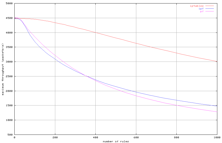 Iptables has not been included in this benchmark because it does not do stateful filtering comparable to pf and IPFilter. The version of iptables that we tested employs connection tracking without any sequence number analysis for packets outside of the initial TCP handshake. While this is unsurprisingly faster, it would be an unfair performance comparison. There is a patch for iptables that adds sequence number checking, but it is still beta and is not included in the GNU/Linux distribution used for testing.