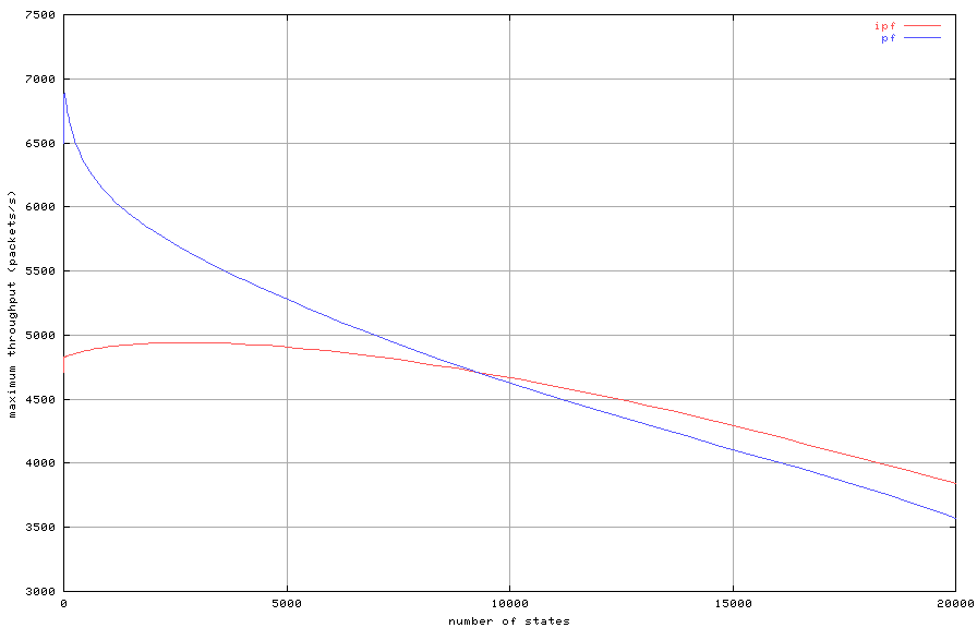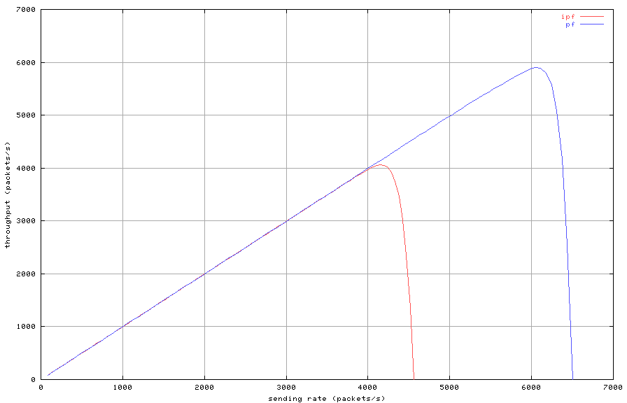 Figure 6 compares the throughput in relation to the sending rate for stateful filtering with twenty thousand state entries. Both pf and IPFilter exhibit the same behavior when overloaded. However, IPFilter reaches overload at a packet rate of about four thousand packets per second whereas, pf does not reach overload until about six thousand packets per second.