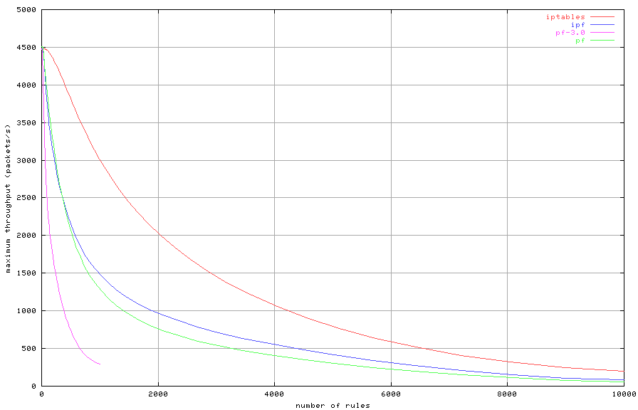 The test is repeated with various rule set sizes between one and ten thousand. For each rule set size, the maximum throughput rate possible without packet loss is noted. The results are shown in Figure 5 as a function of the rule set size. Both pf and IPFilter evaluate the rule set twice for each packet, once incoming on the first interface and once outgoing on the second interface. Iptables' performance advantage is due to the fact that it evaluates the rule set only once by using a forwarding chain. The forwarding chain evaluates the rules set based on a packet's complete path through the machine.